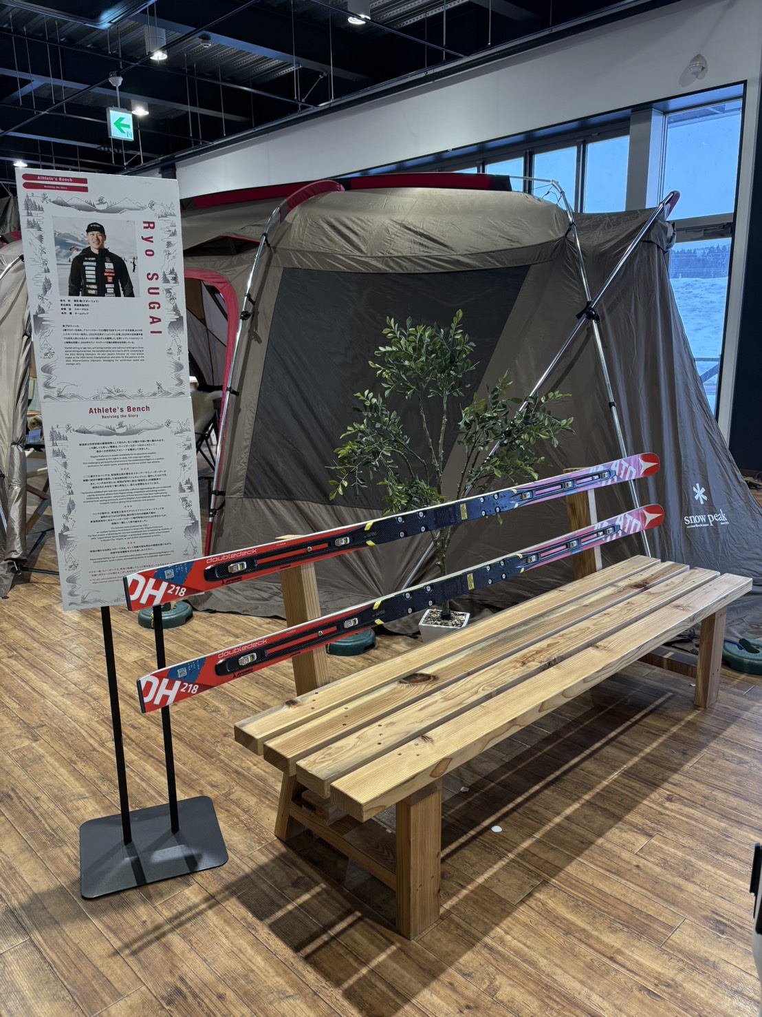 本会場では、須貝 龍 選手 の板を使用したベンチを実際にお座りいただける形で設置させていただきます。