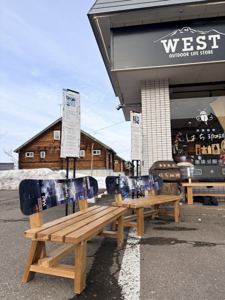 本会場では、平野 歩夢 選手 / 平野 海祝 選手 のお2人の板を使用したベンチをWEST OUTDOOR LIFE STOREの出展ブース内に2日間、実際にお座りいただける形で設置させていただきます。