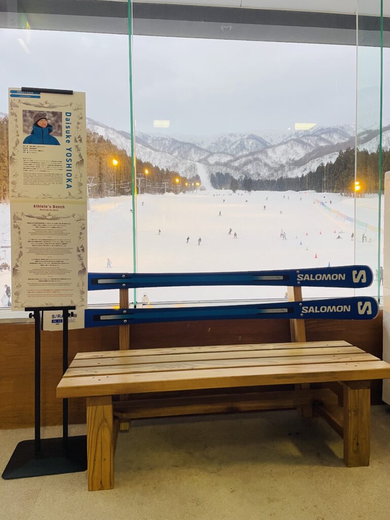 本会場では、吉岡 大輔 選手 の板を使用したベンチを実際にお座りいただける形で設置させていただきます。